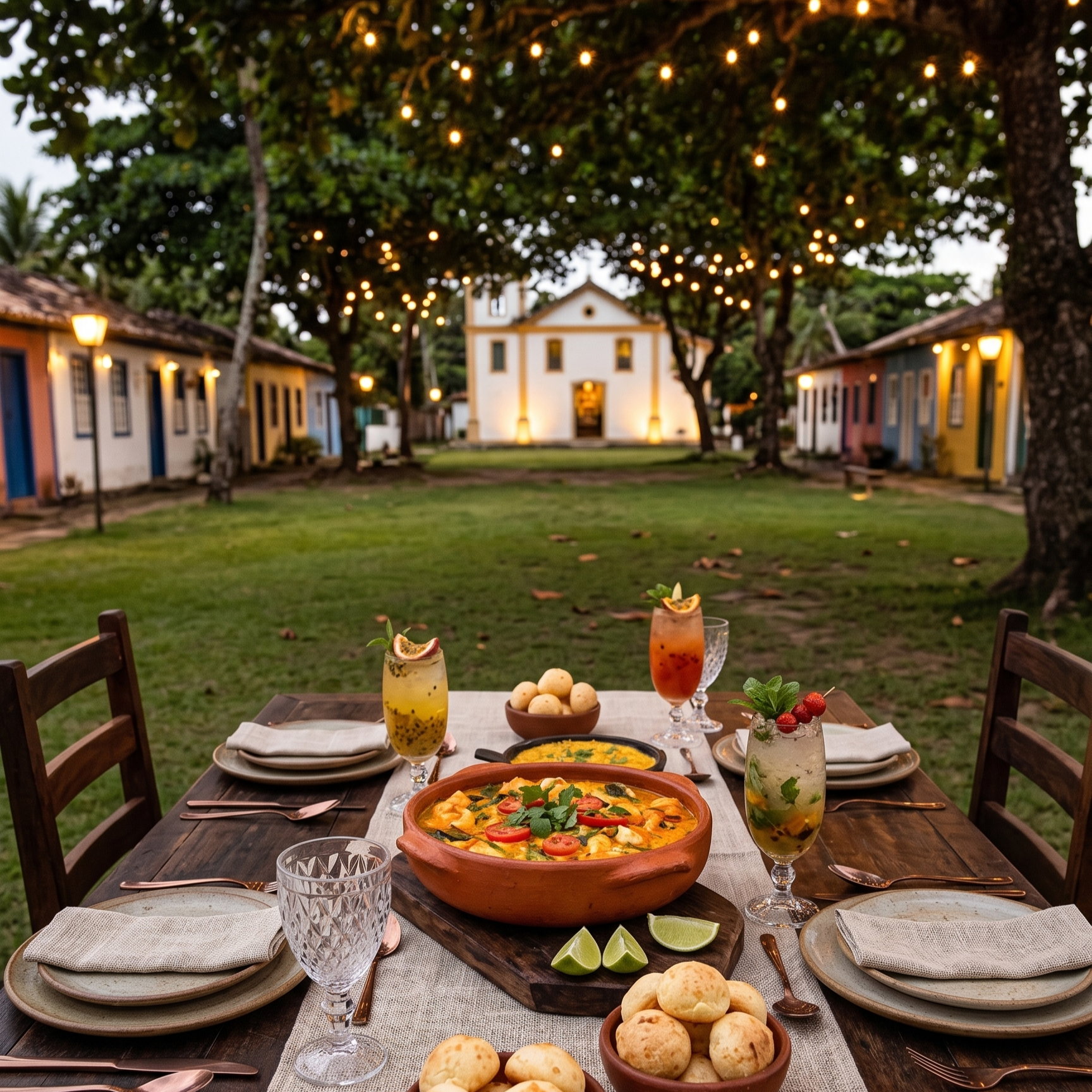 ✧ À savourer : Moqueca de crevettes (le ragoût traditionnel), pain de fromage fondant et cocktails de fruits frais.